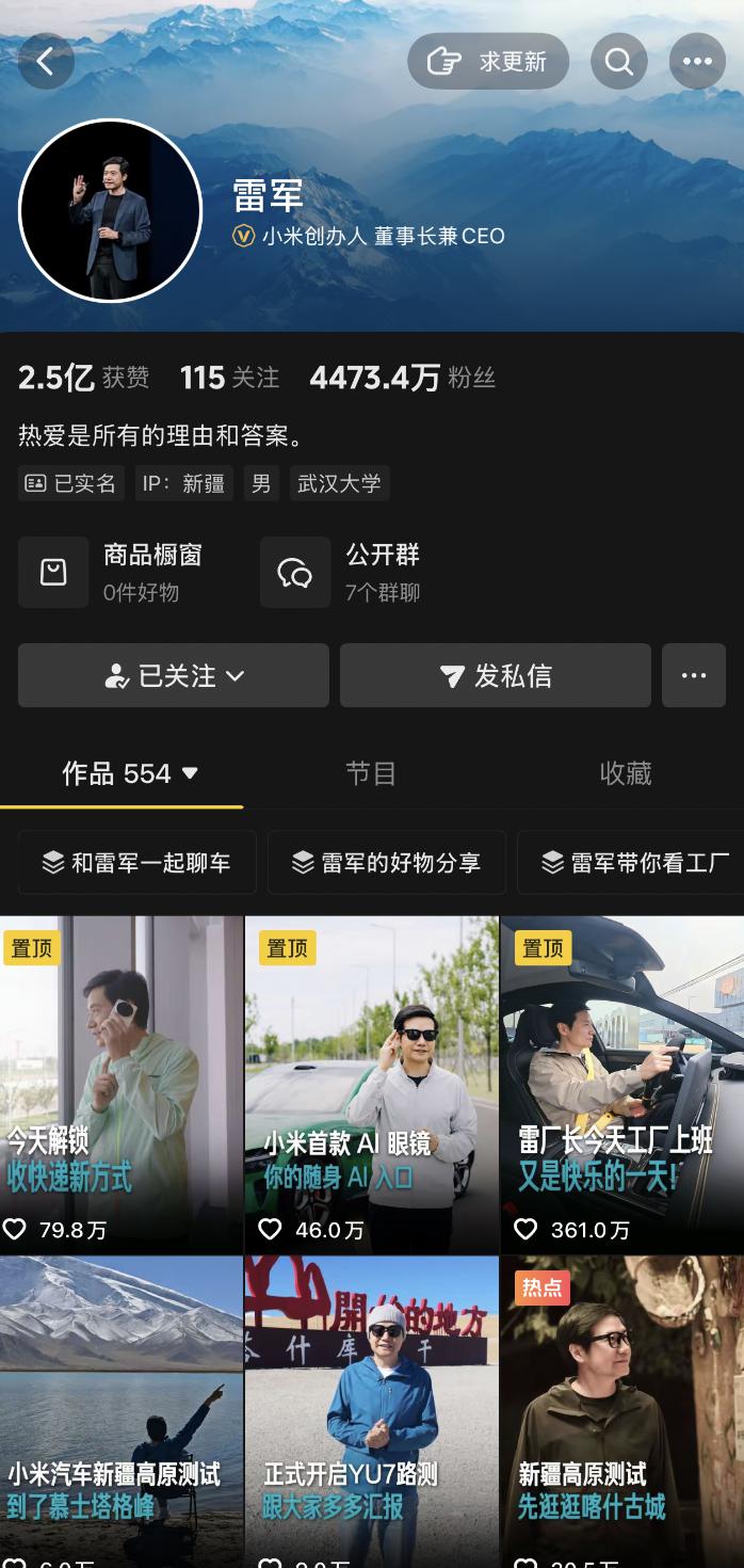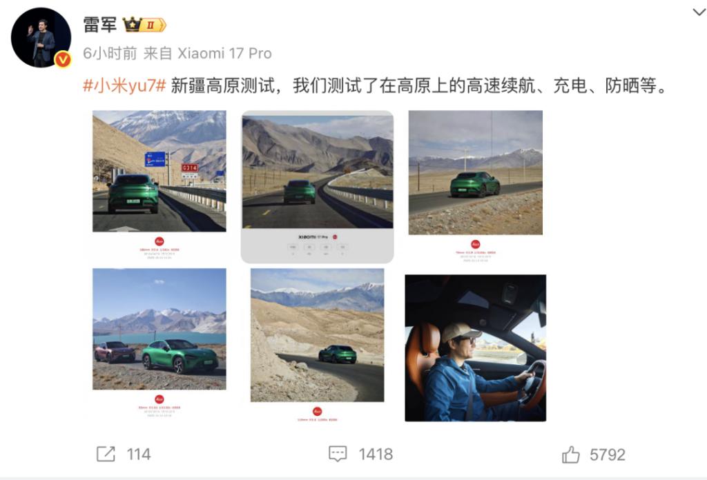 就在车祸事发前一日,雷军还通过社交媒体积极宣传小米 YU7 在新疆的高原路测进展。今日,雷军微博再度更新状态称:" 新疆高原测试,我们测试了在高原上的高速续航、充电、防晒等。 "