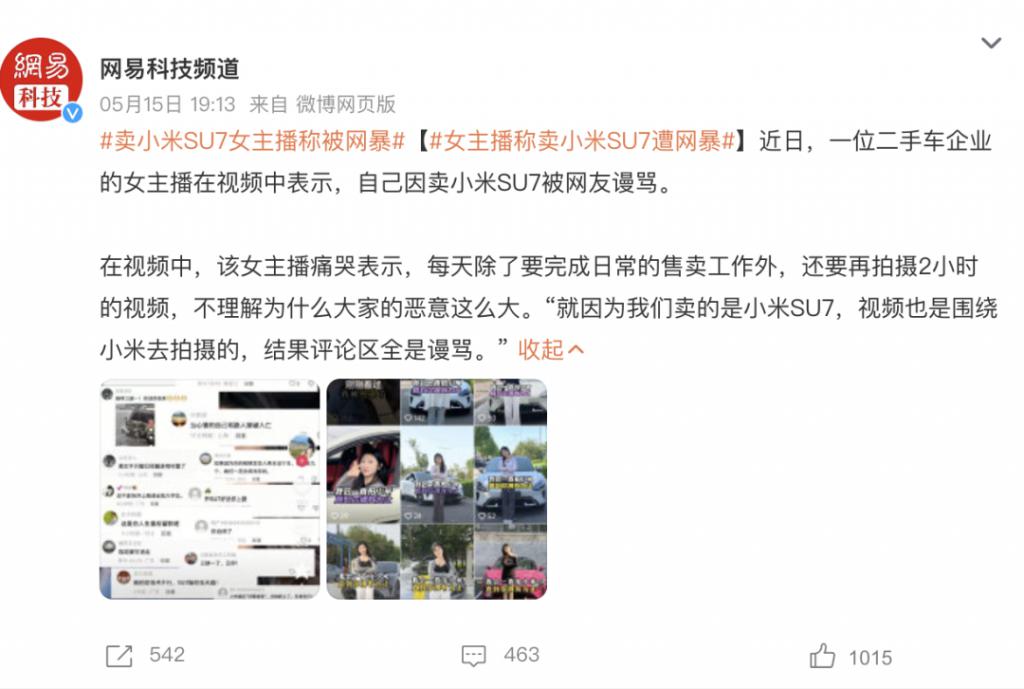 今年 5 月,某女主播因卖小米汽车而遭遇网暴,上百条评论对主播进行谩骂、诅咒,相关事件一度登上微博热搜。