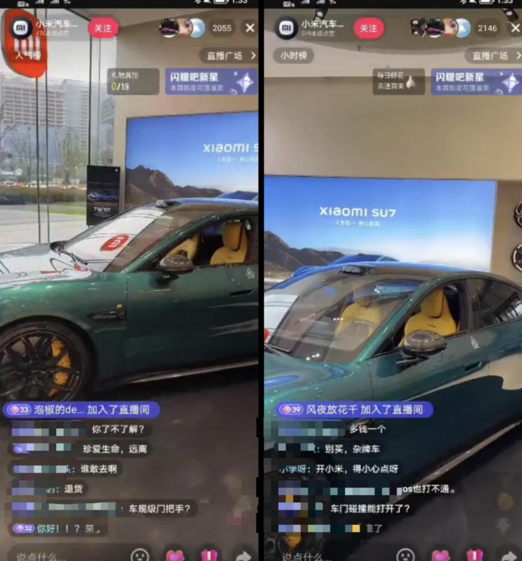 蓝鲸记者发现,10 月 13 日多地小米汽车门店的直播间都遭遇了网暴。部分直播间的在线人数一度超过 2000 人,大量网民在直播间内刷屏 " 门把手打不开、垃圾车、绿化带战神 " 等极端言论。