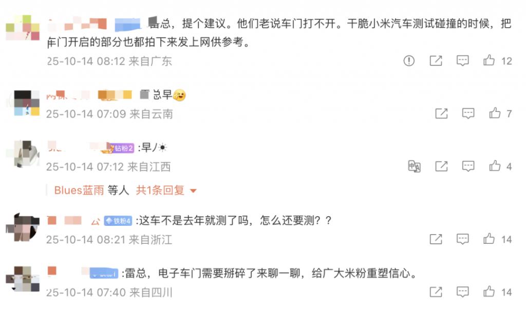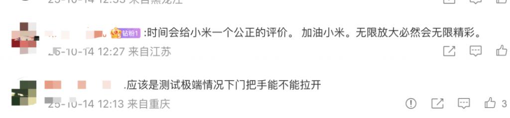 不止是小米汽车直播间,雷军的评论区同样遭到了刷屏。其中关于车门问题的质疑尤为突出,有用户留言道:" 小米汽车车门打不开,是否测试了门把手?"