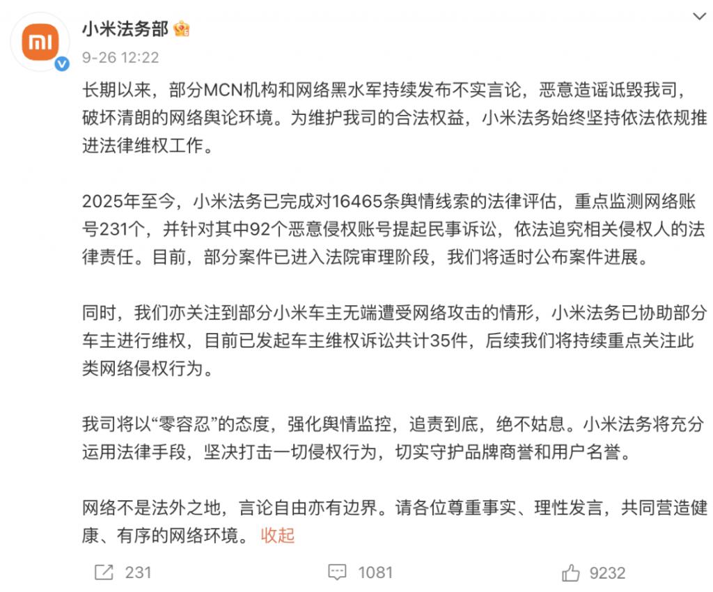 9 月 26 日,小米法务部发文表示,长期以来,部分 MCN 机构和网络黑水军持续发布不实言论,恶意造谣诋毁我司,破坏清朗的网络舆论环境。为维护我司的合法权益,小米法务始终坚持依法依规推进法律维权工作。