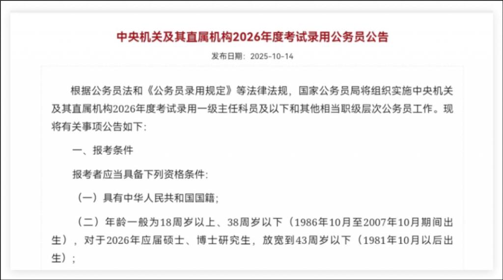说报考者年龄上限从 35 岁提至 38 岁,2026 年应届硕士、博士研究生更是放宽到 43 岁。