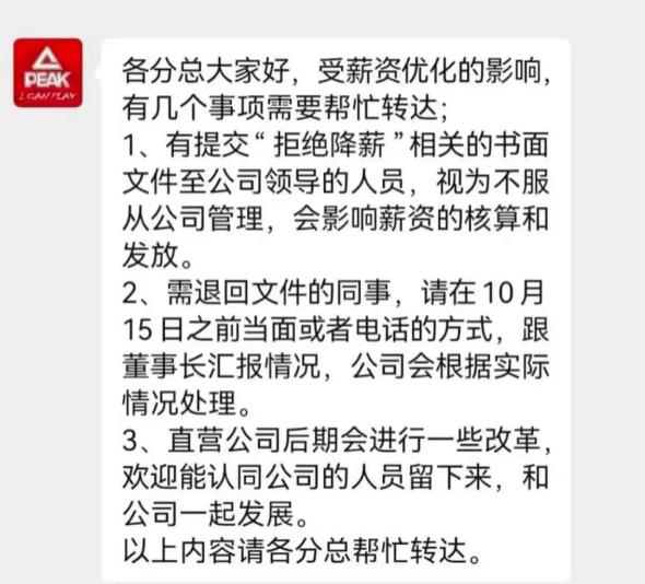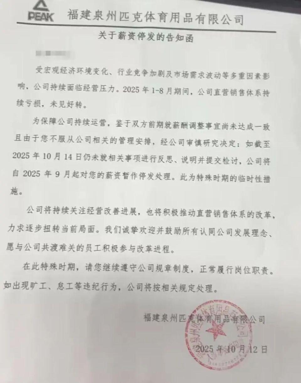 10 月 14 日,有匹克员工向媒体透露,公司向拒绝降薪的员工发出 " 最后通牒 ",要求其在 10 月 14 日前就相关事项进行 " 反思、说明并提交检讨 ",否则将从 2025 年 9 月起暂停发放薪资。