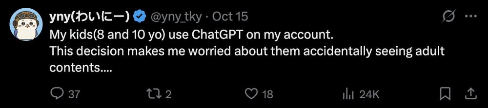 此外也有用户表示,未成年小孩在自己的账户中使用 ChatGPT,这让她很担心他们无意中看到成人内容。