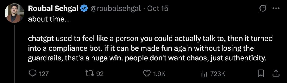 有用户表示,ChatGPT 过去更像一个能实实在在聊天儿的人,现在变成了合规机器人。" 人们不想要吵闹,只想要可靠。"