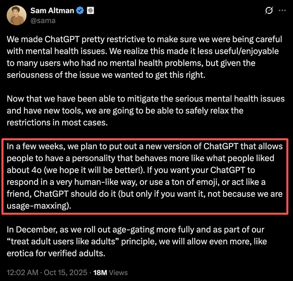 在奥特曼的官宣推文中,除了添加 " 色情内容 " 之外,OpenAI 还计划推出新版本的 ChatGPT,其 " 行为更接近人们喜欢的 4o"。