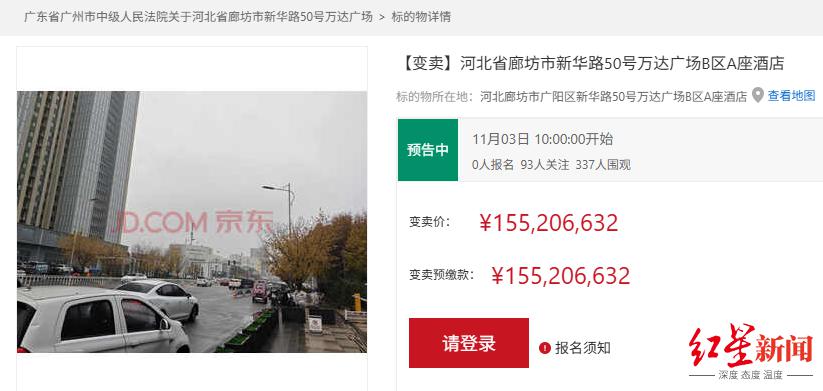 红星资本局 10 月 20 日消息,京东资产司法拍卖平台显示,河北省廊坊市唯一一家富力万达酒店将于 11 月 3 日早上 10 点被变卖,变卖起拍价为 1.55 亿元,较评估价 2.77 亿元直降 1.22 亿元,变卖周期为 60 天,加价幅度为 77.6 万元。另外,福建省宁德市富力万达嘉华酒店也将在同一时间被变卖。