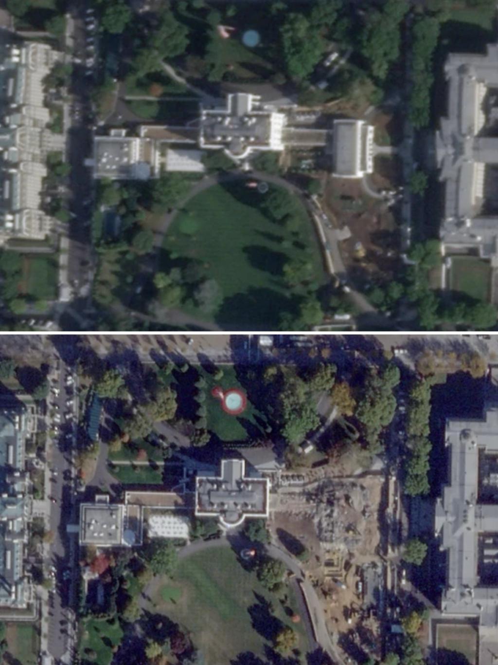 △美国白宫 9 月 26 日(上)与 10 月 23 日(下)的卫星照片对比。