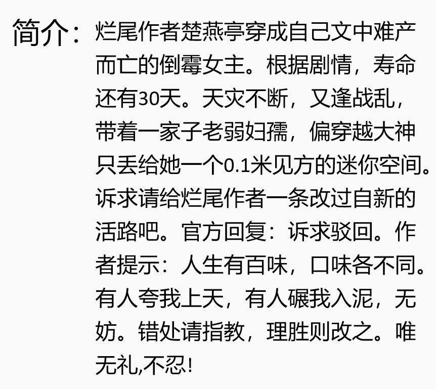精彩呈现:要说她那本《逃荒记》断更称不上,顶多算是‘烂尾’,断更一时爽,一直断更一直爽,断着断着就不想再更新了,索性把她那本才写了不到五万字的小说女主给直接写死。