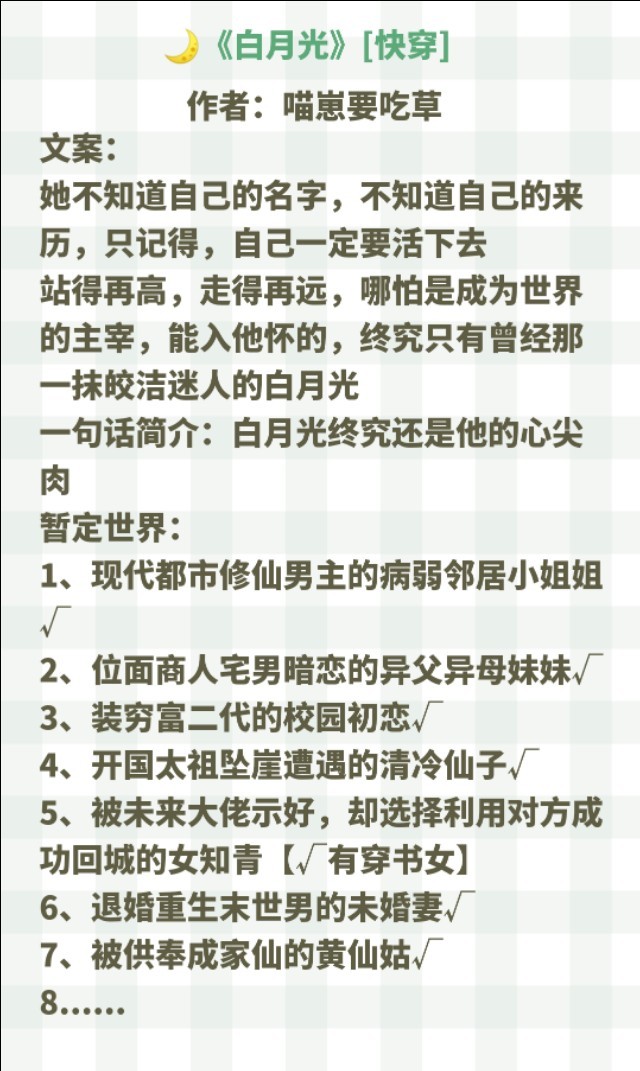 ——穿越成男主们的白月光【白月光系褒义,无黑】,治愈恋爱文,因灵魂脆弱,每个世界女主都无记忆,性格也会因融合原主灵魂而受到影响,可仙可软可柔可御