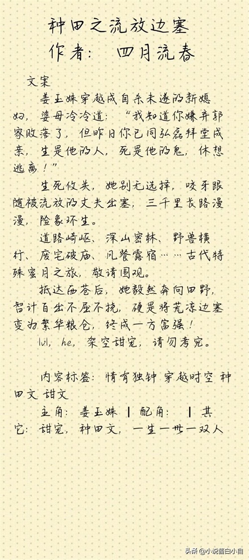 小自短评:本文属于架空年代,女主穿越到自杀的新媳妇身上,随着男主一家去边塞流放,女主一改以往娇弱的形象,在荒芜边塞,凭借不屈不挠和智慧,和男主一起把荒凉边塞变成繁华粮仓,一生一世一双人。
