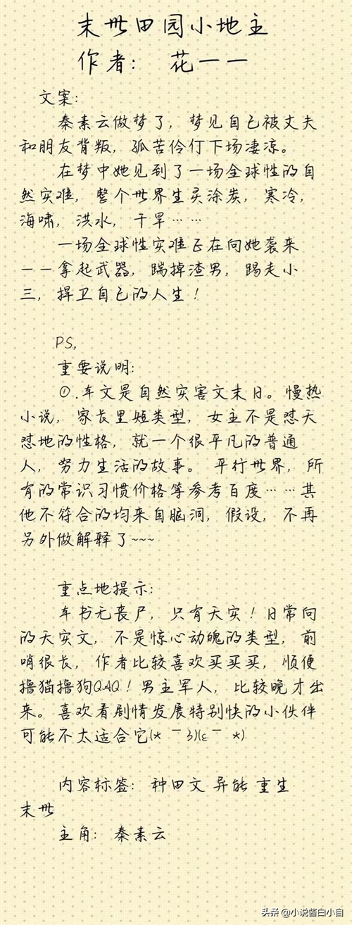 小自短评:本文属于末世异能文,男主是军人,出现比较晚,剧情发展相对较慢,慢热小说,家长里短类型,女主不晃怼天怼地的性格,主要讲平凡普通女孩,努力生活的故事。