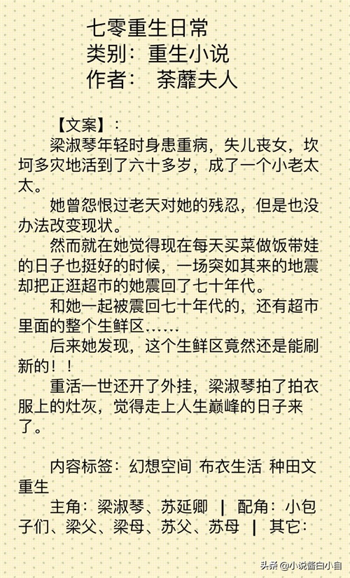 简评:本文女主重生回到七零年代,有金手指,前世凄惨的一生,这一次只想好好的生活,走向人生巅峰。