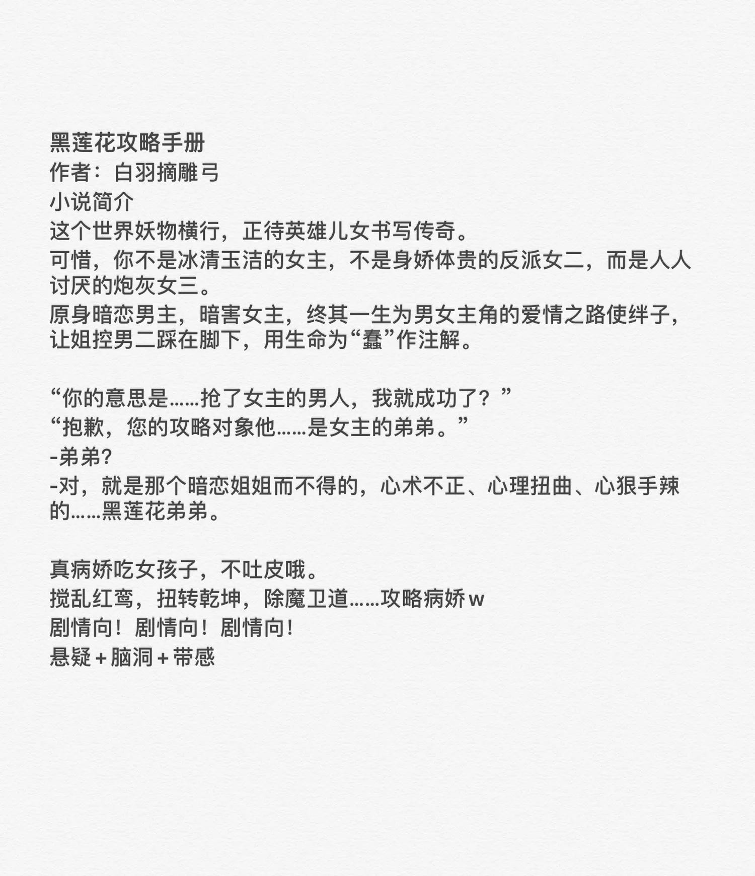 虽然这沙雕的小说名字真的让人望而却步,但是,还挺好看!女主在攻略过程中死了两次,第一次穿进去是一个糙汉山匪,后面两次是小姐姐。感觉和黑莲花攻略差不多类型的小说。喜欢这种的可以一看。