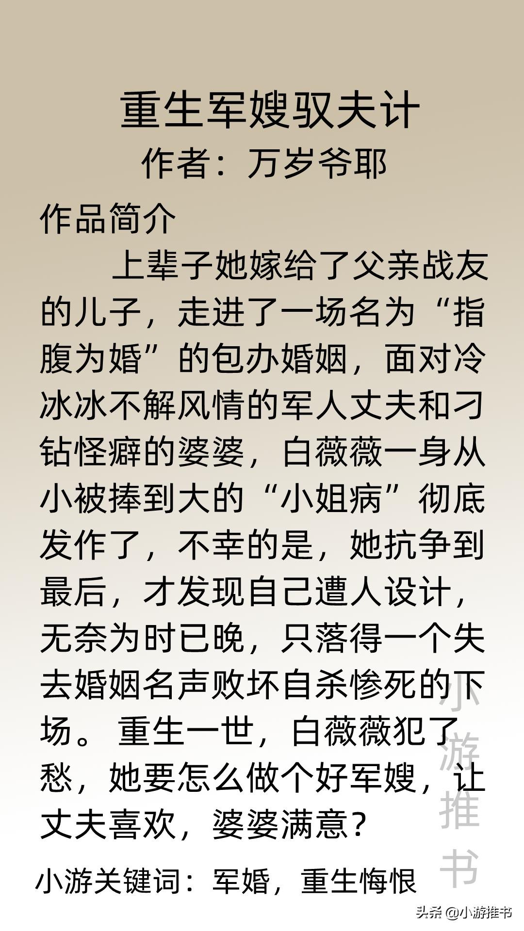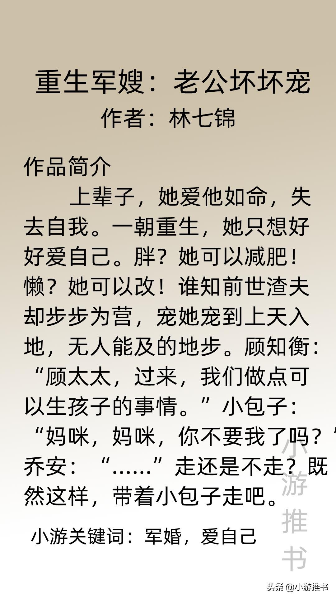 大家好,我是@小游推书,军婚小说在年代文里居多,军嫂与兵哥哥的感情好上头!今日精心为大家推荐三本女主重生的军婚文,剧情温馨,家长里短,女主重生后努力生活,与兵哥哥的爱情也是又甜又撩,是书荒者的福利,不要错过啦!赶紧收藏起来慢慢看吧。#小说##军婚##言情##年代文#