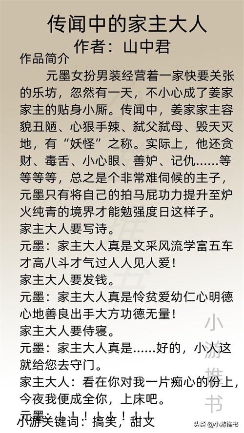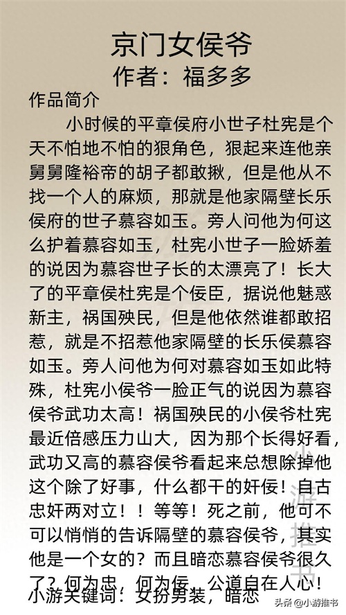 大家好,我是@小游推书,今日推荐五本女扮男装的古言小说,剧情好看,女主因家庭女扮男装撑起家族,或者为在古代好生存,和男主的互动也极其搞笑。书荒必备!#小说##小说推荐##言情##大家有什么n刷的小说,可以推荐一下吗#