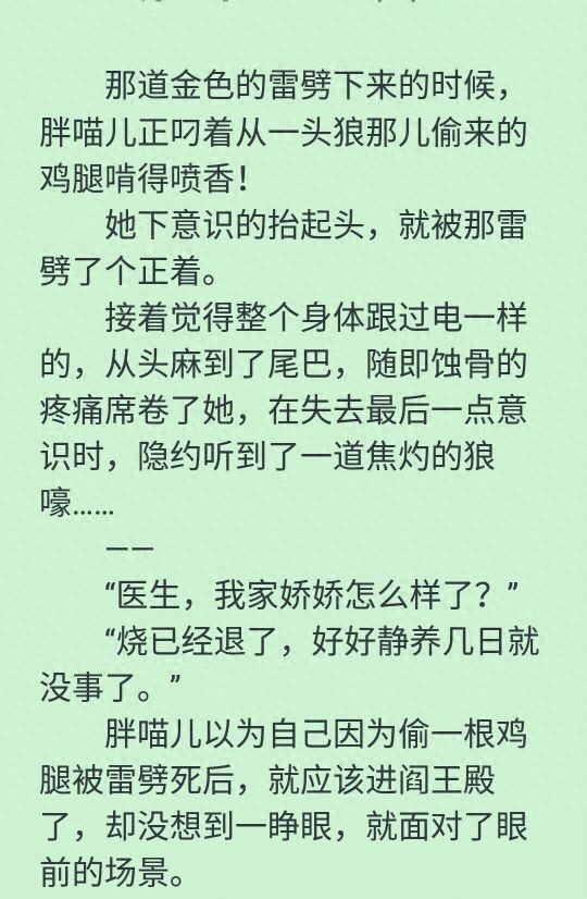小说内容,女主之前是一只胖喵,偷吃鸡腿被雷劈重生到了生了九个孙子就盼一个孙女的家庭,成了全家的宠儿。男女主是双穿越,男主前身是一头狼,穿越之前就一直保护着胖喵。穿书之后更是为了女主学习如何做人,背景是穿书,现代的,但是有点玄幻色彩,就不多说了。