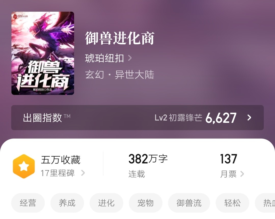 玄幻宠物流,金手指看宠物资质,设定相对合理,无明显毒点,看点主角的宠物晋级合成。剧情也不拖沓。特别是和家族的态度和我胃口!主角不忘恩,接受的东西会想着回馈,他双亲死亡,家族也没亏待他,给他资源成长,后来他有本事了,也记得给家族修炼法,资源之类的。反正就是有仇报仇,有恩报恩!除了感情戏有点尬。我是真喜欢主角的性格!此书值得一看!