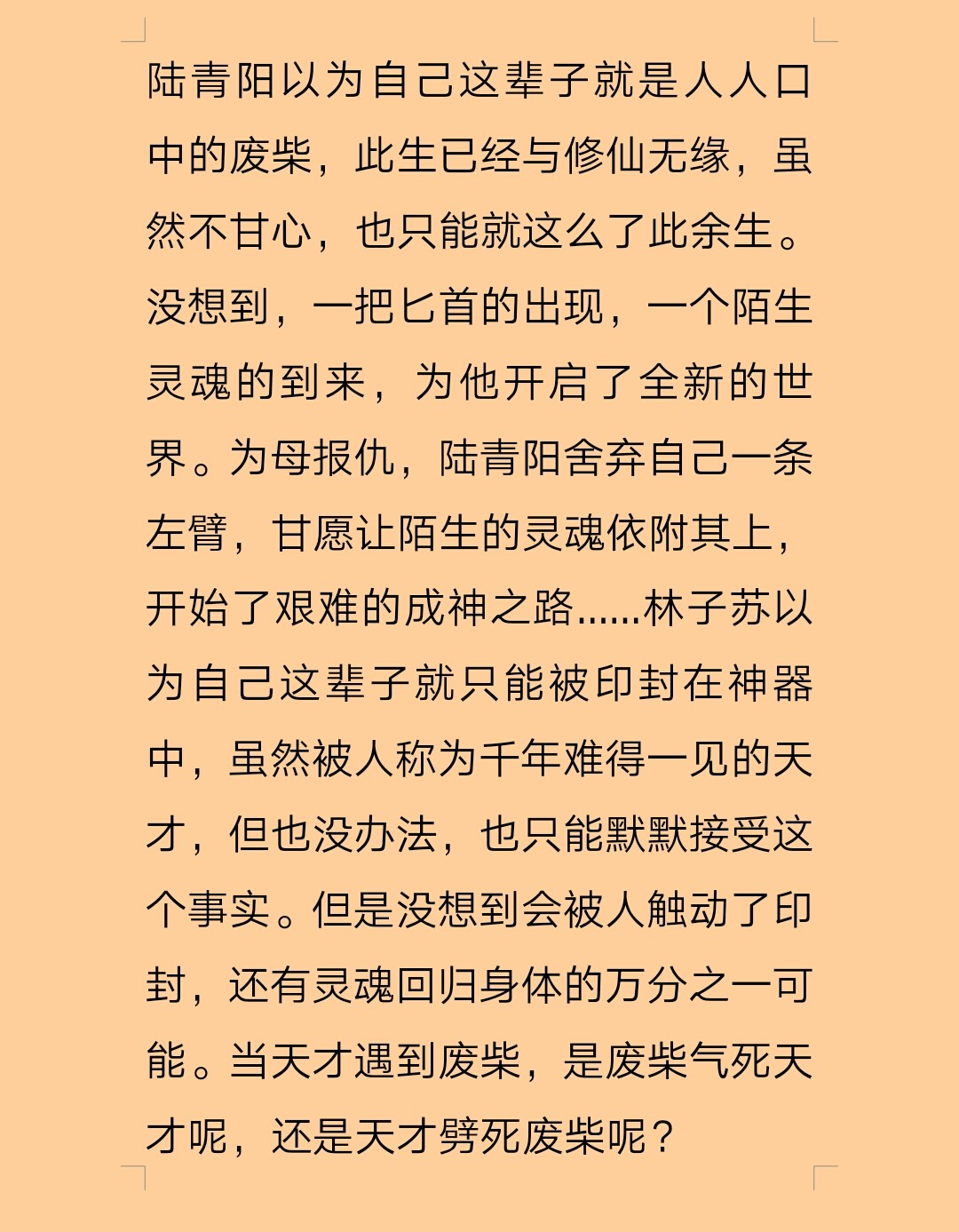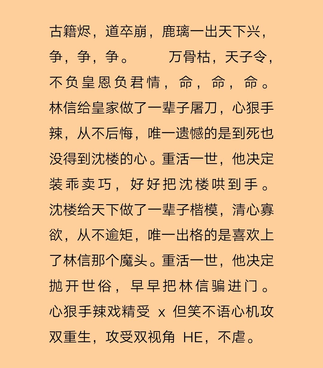 简评:沈楼为了让林信与他一起重生,甘愿让自己的灵魂被撕裂,重生后疾病缠身。他不仅为拯救苍生而活,也是为他而来。林信前世效忠皇家,成为大魔头,只是可惜到死依旧是孤单一人。好在他们是互相爱慕的,双双重生,未来可期。本文幽默风趣,特别是林信的师傅,行事非常搞笑。有一对双胞胎兄弟有玉和无墨,感情深厚令人动容,其中一人死后,另一人决意要留住他的灵魂,两人共用身体。
