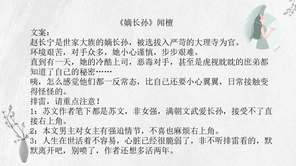 《嫡长孙》女主赵长宁,因为家族原因,从小被迫女扮男装,成为世家大族的嫡长孙,通过科举立于朝堂之上与各路人马发生的故事。对这本小说又爱又恨,好看在作者文字驾驭能力极强,可读性很高,狗血的故事大家也都爱,本文的狗血洒的又不够,多了一层尴尬。故事线前半程还算流畅,后半程则天雷狗血齐放,女主探花郎,自立自矜自强体弱,太子、皇子、将军、前朝皇子、同僚人人都被她清风明月般的气质和清俊冠京城的颜值所吸引,纷纷爱上她!