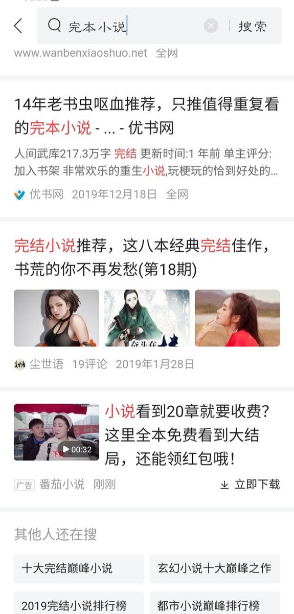 科普今日头条书荒找书方法:头条app上方的搜索框输入:完本小说,就会有很多相关的小说推荐,如下图所示: