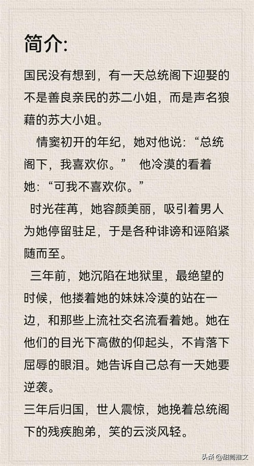 读后感:这本又虐男主又虐女主,典型的追妻火葬场。前面觉得男主太过冷静,而女主太过骄傲了,看到后面才知道男主算计了所有人包括他自己,只为了女主(剧情不适合剧透)男主爱的比较疯狂霸道,在他心中最重要的是女主,孩子都比不上。女主人设也讨喜,敢爱敢恨,聪明独立不圣母。