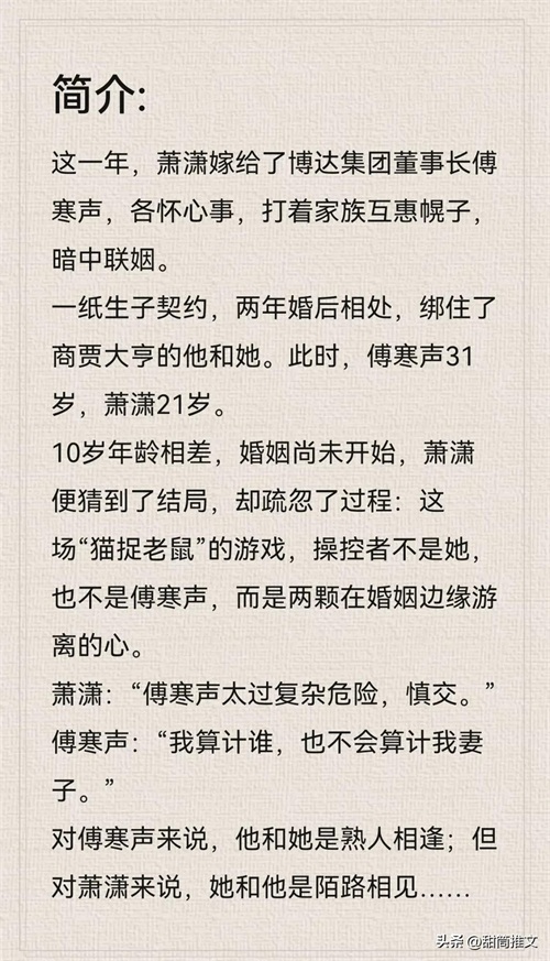 读后感:这本属于先婚后爱➕生子契约,不虐。女主是清冷型,沉默寡言,隐忍坚韧倔强,但是很有主意。(女主有个前男友)我很喜欢女主的性格与处事态度。而男主傅寒声简直是神仙男主了,他对女主其实是蓄谋已久了,深情却又隐忍,心思深重独不算计女主,后期还给了女主足够的自由。整体是男强女强的感觉,他们的爱是细水长流的爱,刻骨铭心。
