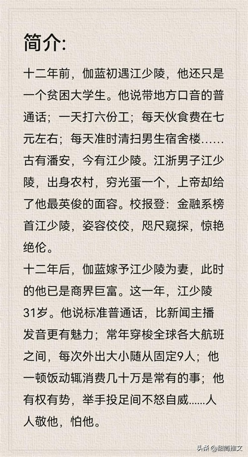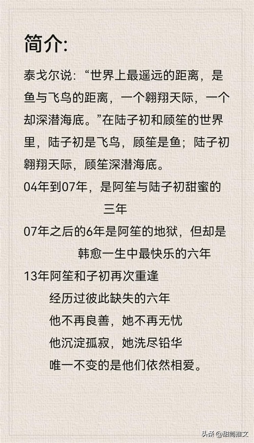 读后感:这本属于破镜重圆,虐恋情深文(从校服到婚纱)一开始是女主倒追男主,但女主有自己的想法,不会死缠烂打,也没有失去自我。男主初期开公司遇到瓶颈,女主为了给男主筹资金去参加比赛的时候(她不知道男主公司已经渡过危机了)女主妈妈脑溢血死亡,后面就开虐了。多年后和男主结婚一直漠视男主。总之这本里你想看的虐恋、情深、狗血都有。(男女主彼此相爱)