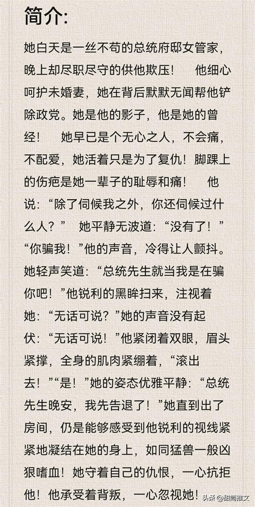 读后感:这本也很虐,但是简直不要太上头,哈哈。男女主的情路很坎坷,各种误会各种猜忌,但再多的仇恨也改变不了男主对女主势在必得的决心。女主很可怜,很多不好的事情发生在女主身上,但幸好有男主保护她(书中孩子是男女主的,只是女二偷来代y的,男女主彼此相爱)