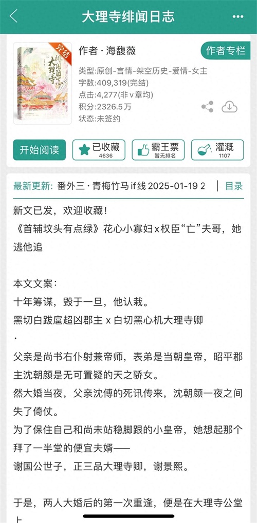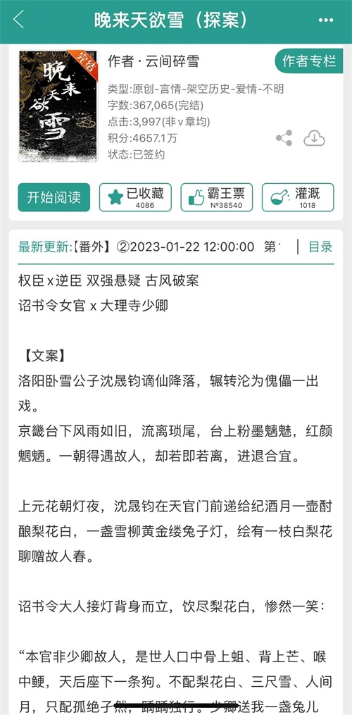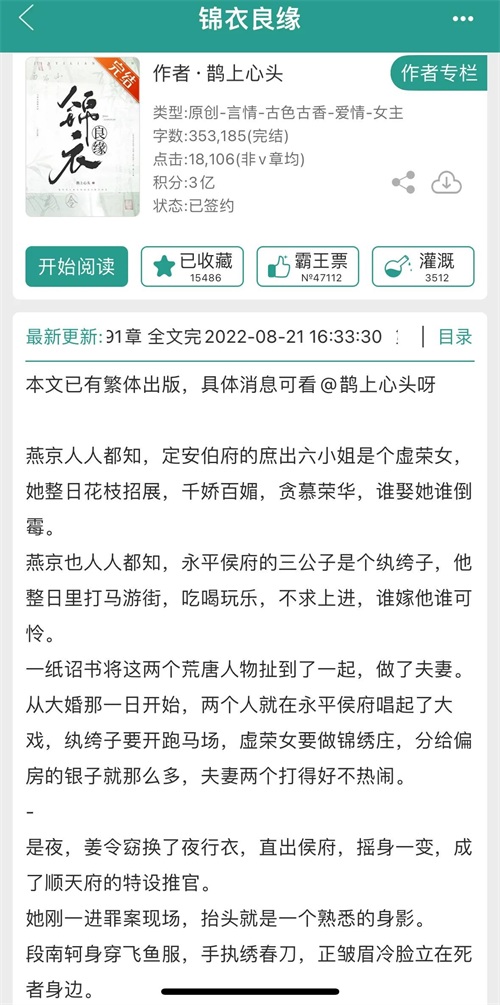 案件推理逻辑缜密,穿插幽默互动,缓解权谋压抑感。两人从互相算计到双向奔赴,感情细腻,又甜又虐,还不错哦!而且这本是免费的!!赶紧看起来!