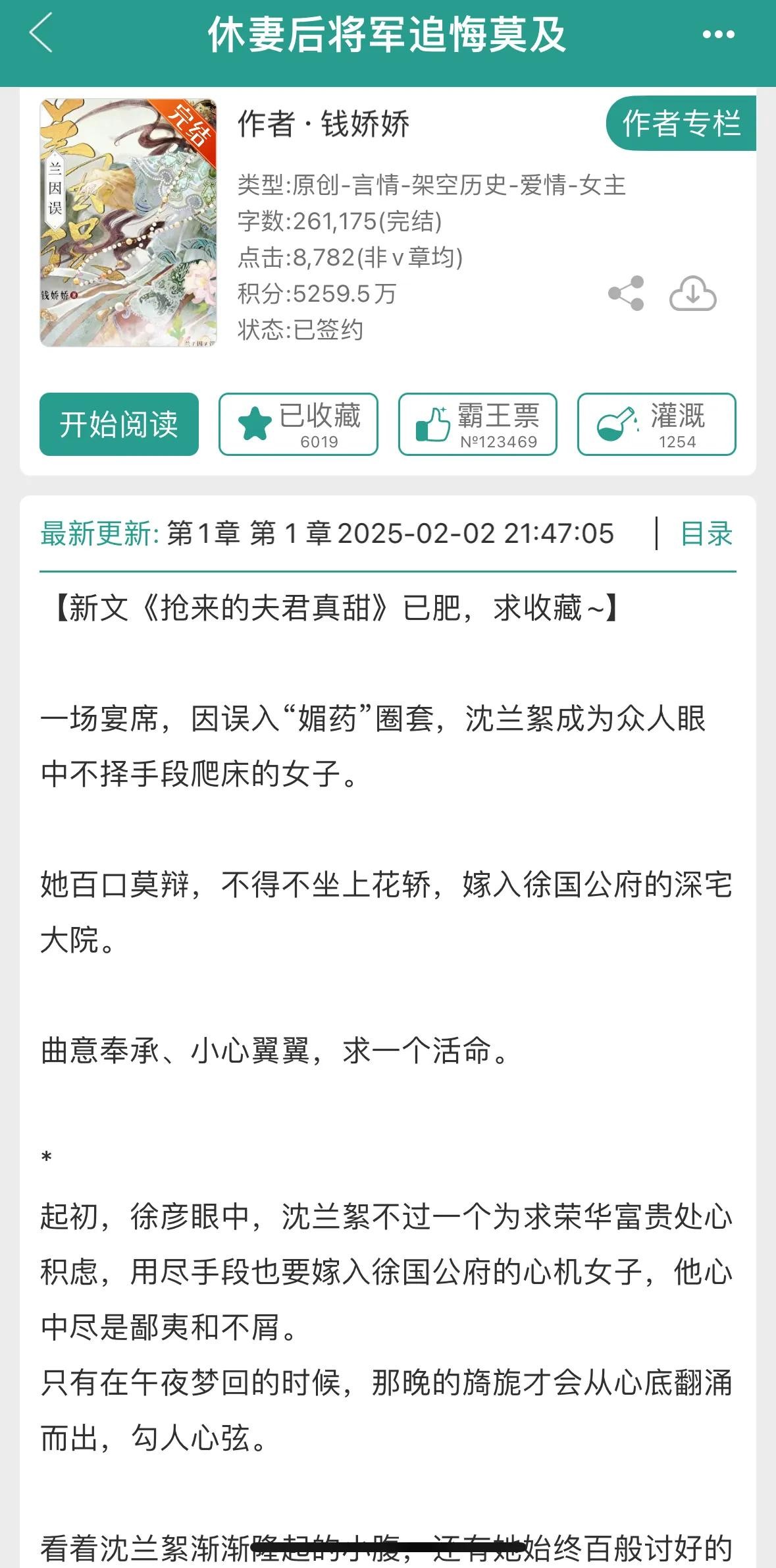 这本是追妻火葬场哈!讲述冷面将军徐彦与机敏庶女沈兰絮从互相算计到双向奔赴的故事。