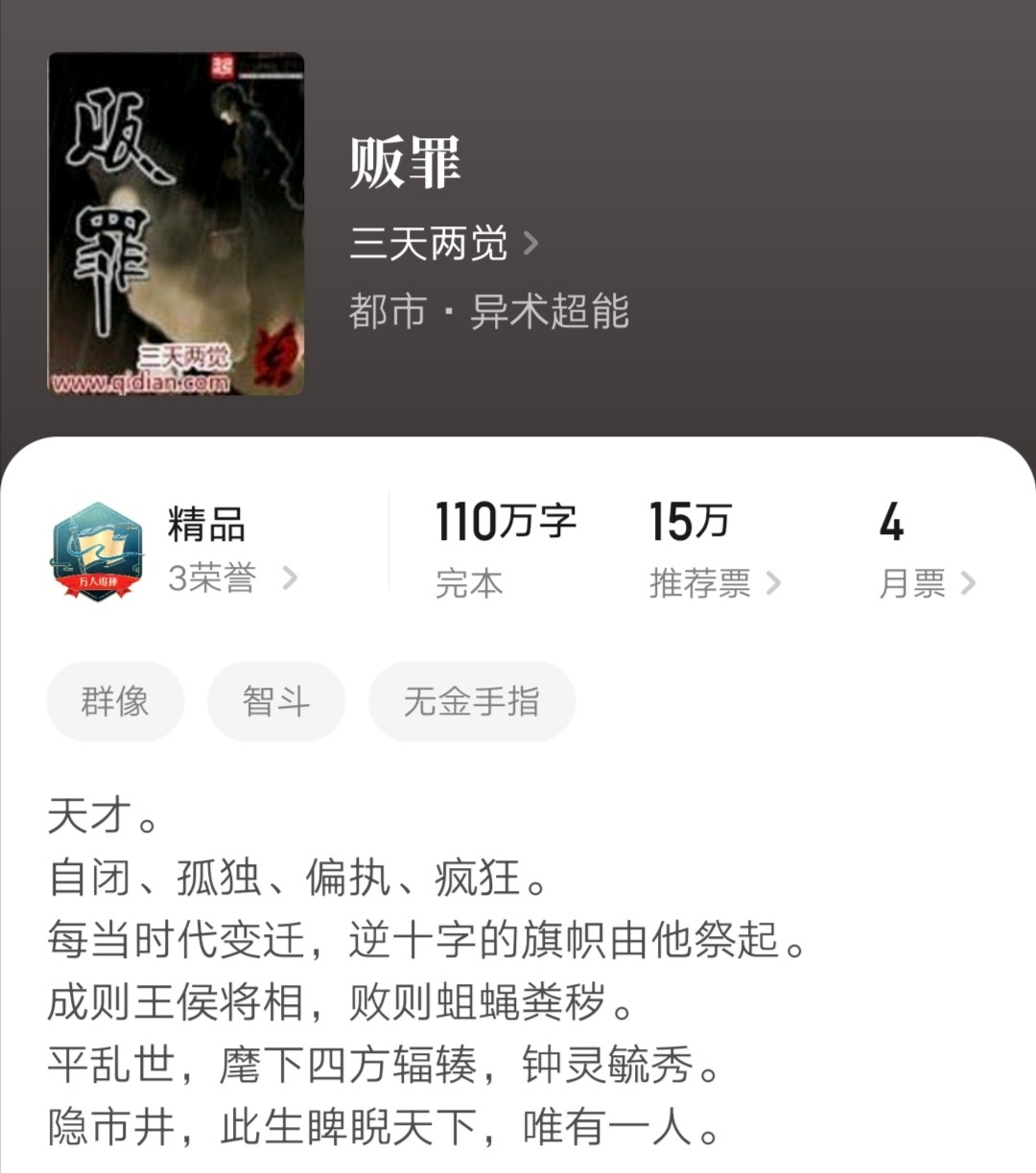 这一本也是纯粹的高智商小说,要带脑子看的单元剧,每次看这种小说我就累的不行,一定是出生时智力点没加明白,接近十年的老作品了,作者三天两觉。