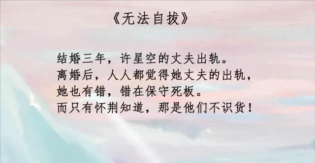 书评:离婚女主、现言题材。许星空与丈夫王舜生结婚三年,在他出轨酒吧兼职大学生后,尽管许星空性格软糯,但还是潇洒选择放手。路上许星空的车与怀荆的车意外发生擦碰,面对男人刻意的调戏,想起亲戚对自己离婚没人要的评价,许星空带着报复和赌气,与这个陌生男人发生了亲密关系。