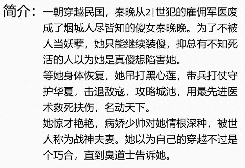点评:超有意思超棒的文,乱世出英雄的年代,军人男主娶傻妻女主时,就有对婚姻一生一次一次一生的决定,又是双洁,女主的前世是军医。