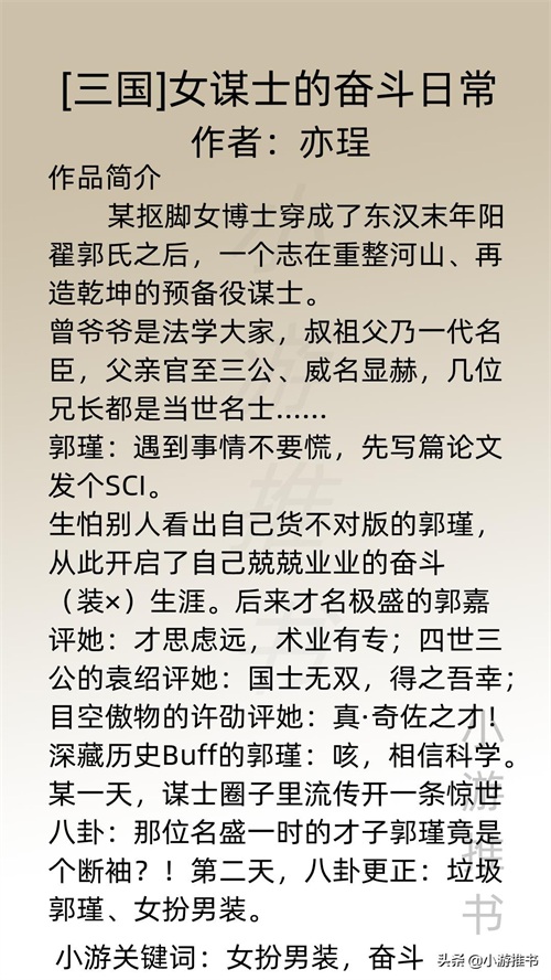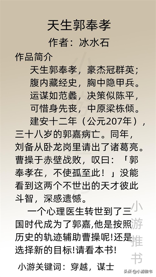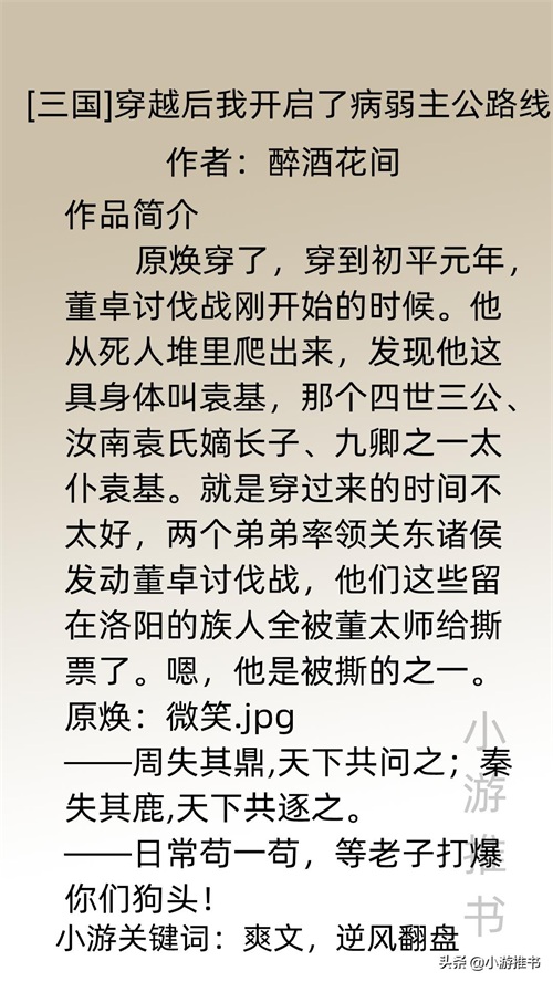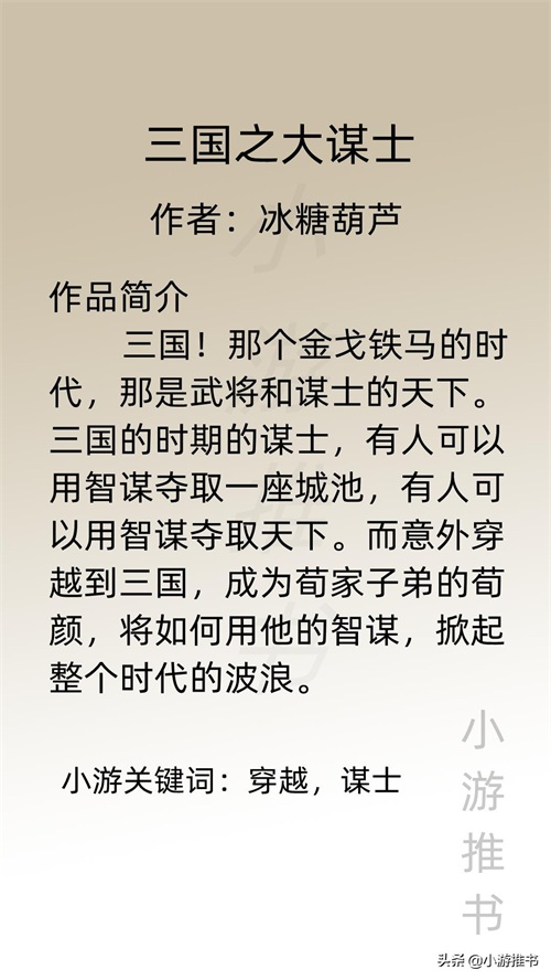 大家好,我是@小游推书,历史小说一直深受我的喜欢,今日推荐七本关于三国的历史小说,有主公向,谋士向,当主角穿越三国,看历史如何走向。主事业文,剧情超爽不拖沓,文荒必入!#小说推荐##网文#