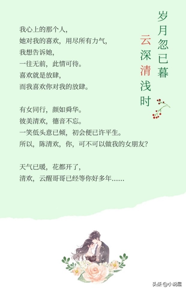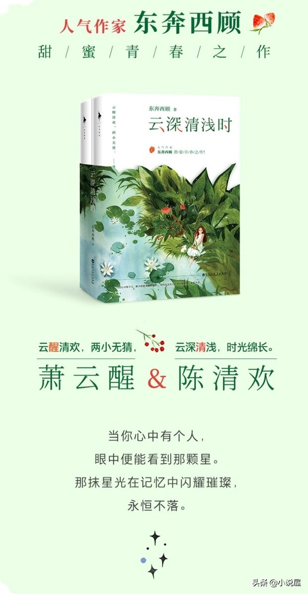 短评:《云深清浅时》是东奔西顾自《你是我的小确幸》后历时三年写就的。本书讲述了陈慕白和顾九思之女陈清欢与萧子渊和随忆之子萧云醒的故事。从中学开始写起,穿插青梅竹马、两小无猜的小时候,从大学篇校服到职场篇的婚纱,学霸骄矜少女陈清欢与运筹帷幄的翩翩少年萧云醒。