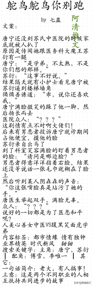 4.《鸵鸟鸵鸟你别跑》人美心善女中医VS腹黑笑面虎学弟。