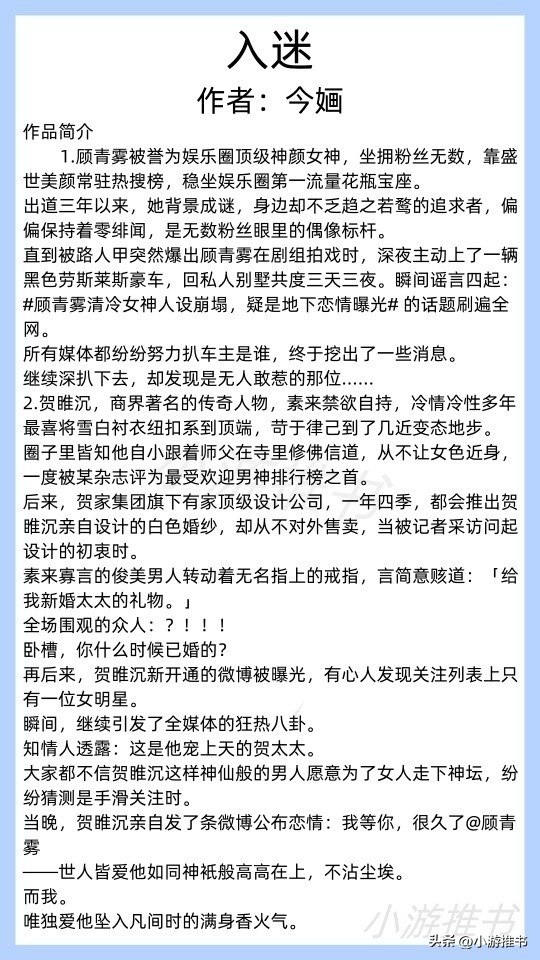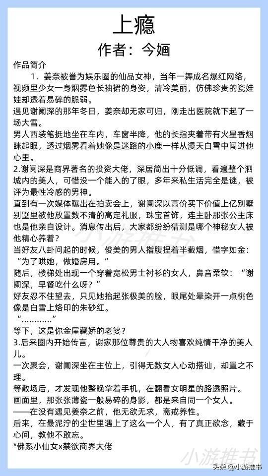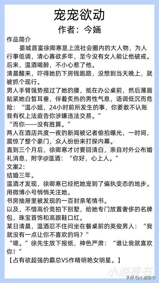 三本现言甜文 男主疯批偏执斯文败类《盲杖》《宋先生的宠妻计划》 大家好,我是小希阳! 每天给书迷们推荐好看的小说,欢迎入坑!来关注一下,减少书荒时刻,让你不再忧愁找不...