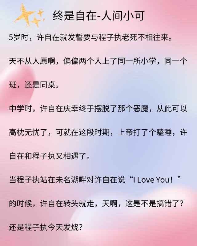 《终是自在》讲述的是许自在与程子执的爱情故事。两人是在同一个大院里长大,由于最初相遇时并不美好,所以后续很长时间里,两人都是看对方不顺眼的状态。