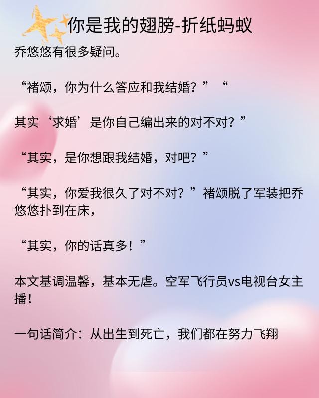 《你是我的翅膀》讲述的是乔悠悠和褚颂的爱情故事,褚颂是飞行员,乔悠悠是电台主播,两人的故事属于先婚后爱。
