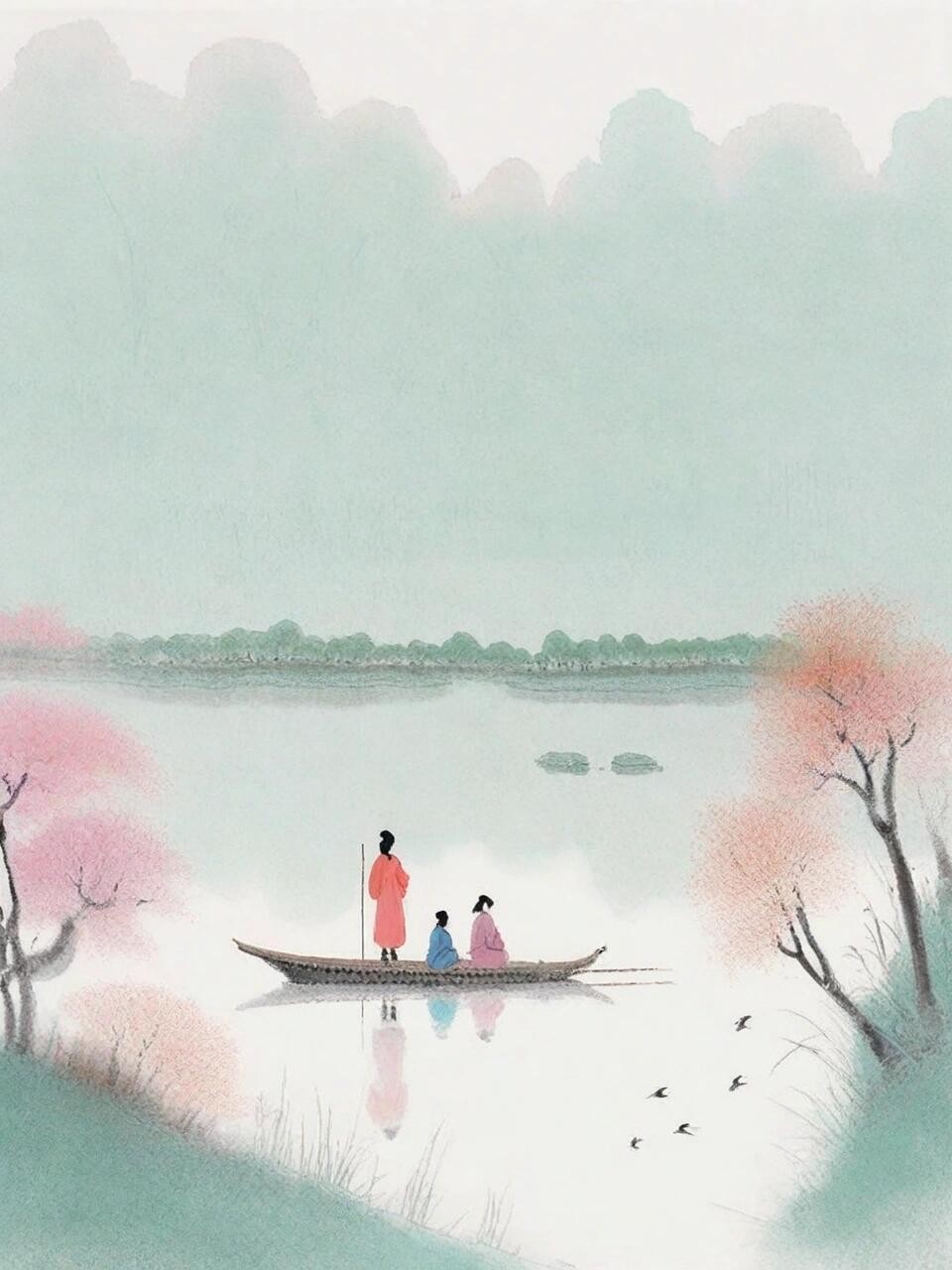 烟雾朦胧中,鹁鸪的叫声忽然传来,细雨昏沉里,豆蔻花儿悄然开放。小船如同在画中缓缓行去,美酒从村尾买来。在这烟雨江南与行舟沽酒的画面里,有一种超脱于尘世纷扰的闲适,心灵于鹁鸪啼鸣、豆蔻花开中,仿若在江南水乡的诗意里,沉醉不知归路。