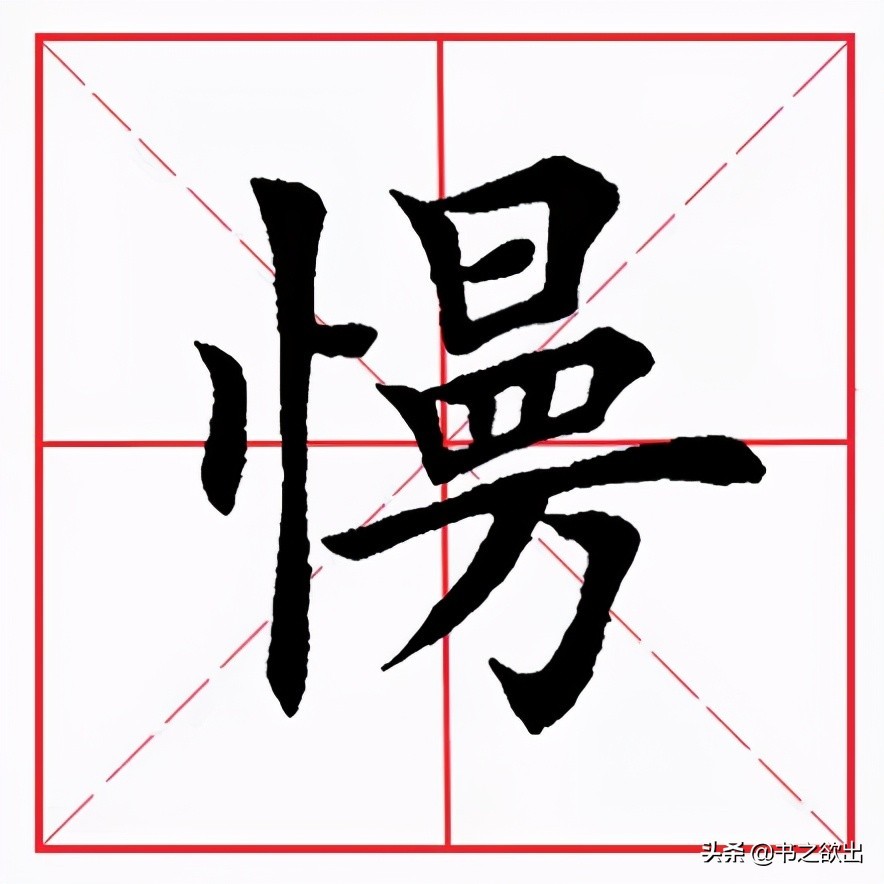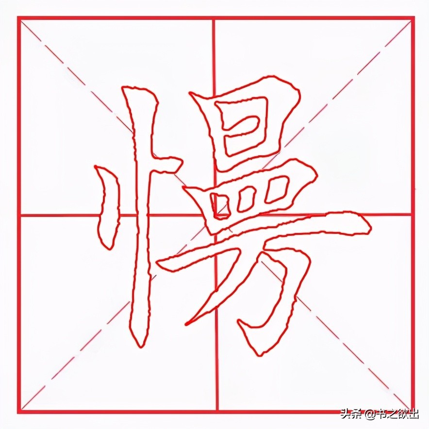 异写,注意竖心旁的笔顺。首笔左点露锋轻入,向下略重,稍带弯度;右边点笔写作横点,不要写大,与左点的起笔基本平齐;竖笔平切,中间稍细,垂直有力;右部“曰”字不要写宽,上宽下窄,整体抗肩;下面“四”字形体稍扁,不要写高,抗肩,四个竖笔间距相等;长横起笔左探,左边抗肩稍大,右部略平,收笔稍下拉;下面“横折斜钩”起笔勿重,注意位置,横笔勿长,到位后折锋向左下行,注意角度,到位后跪笔弹锋出钩,钩角稍低于左竖;撇笔从横画里起笔,撇身稍直,不要写长。