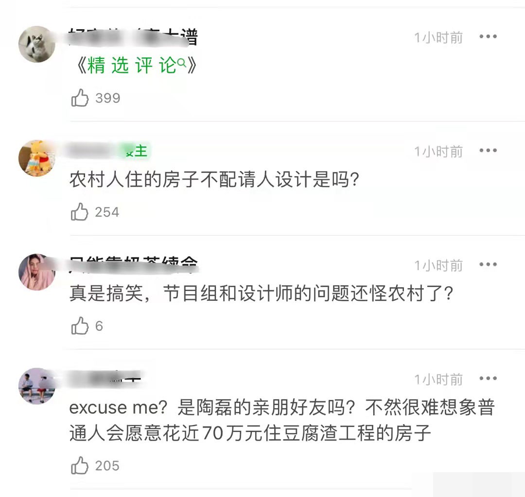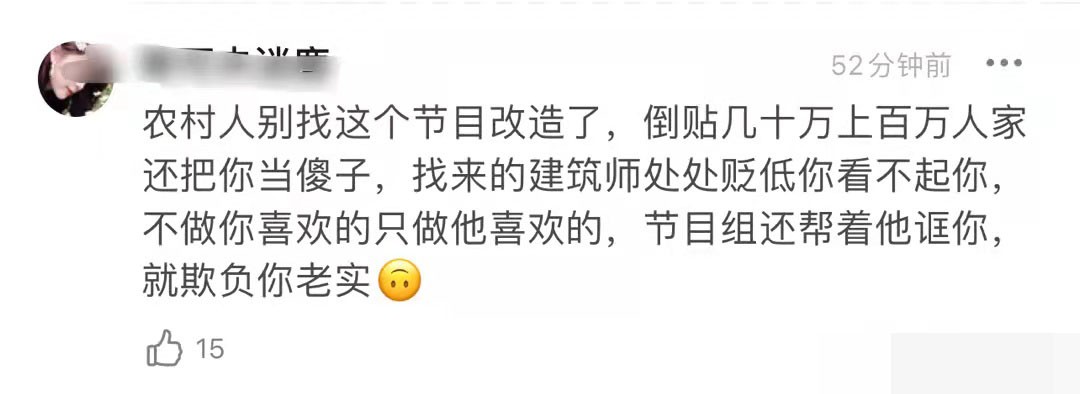 而《梦想改造家》节目组是怎么做的呢?因为害怕被大家骂,他们的微博评论都是精选的,而在精选中,留有了这样一句发言,把锅都甩到了农村人身上,说得好像节目组很委屈一样,都是农村人在没事找事。