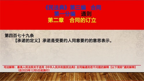 大家好,现在学习《民法典》第479条【承诺的定义】。第479条承诺是受要约人同意要约的意思表示。这个承诺的定义是对要约的接受,是指受要约人接受要约中的全部条款,然后向要约人做出同意按要约成立合同的意思表示。所以承诺与要约完整链条完成以后就构成合同了。