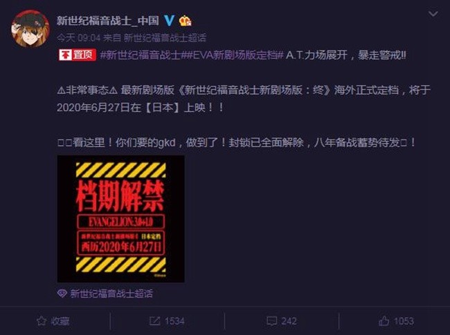 1905电影网讯12月27日,@新世纪福音战士_中国微博发布消息,宣布“最新剧场版《新世纪福音战士新剧场版:终》海外正式定档,将于2020年6月27日在日本上映!”同时,日文、英文两版定档海报也相继释出。目前,尚无影片在国内上映的相关消息。