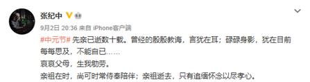 9月2日晚上,知名制片人张纪中在社交平台发文怀念先亲,并晒出几张近照。