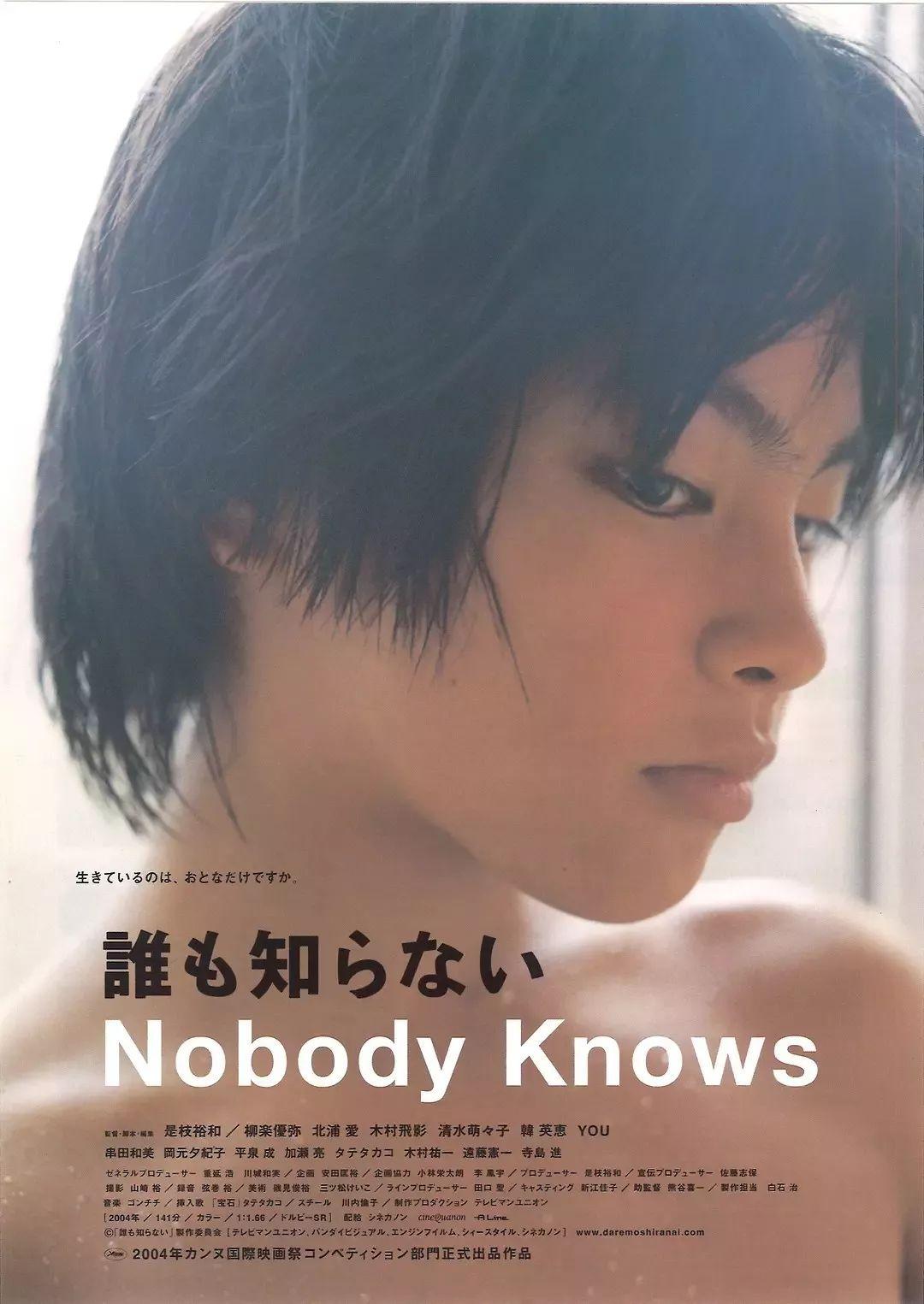 《无人知晓》是他评分较高的电影之一,根据真实事件改编。单亲母亲惠子带着四个孩子明、京子、茂、雪一起生活,然而突然某一天妈妈不见了,只留下了20万日元现金和一张短短的便条,四个孩子只能尽力活下去。水电早已经停了,明天就要没饭吃,然而这一切都无人知晓...