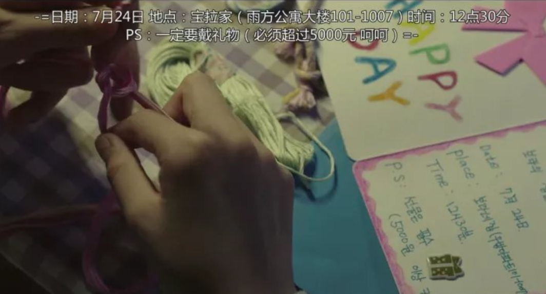 得知要参加宝拉的生日会,需要准备超过5000元的礼物,李善拿不出那么多钱,于是她亲手编了条手链,想作为生日礼物送给宝拉。她按照宝拉告诉的地址,高高兴兴地去参加生日会,却发现地址是错的,自己还是被骗了。