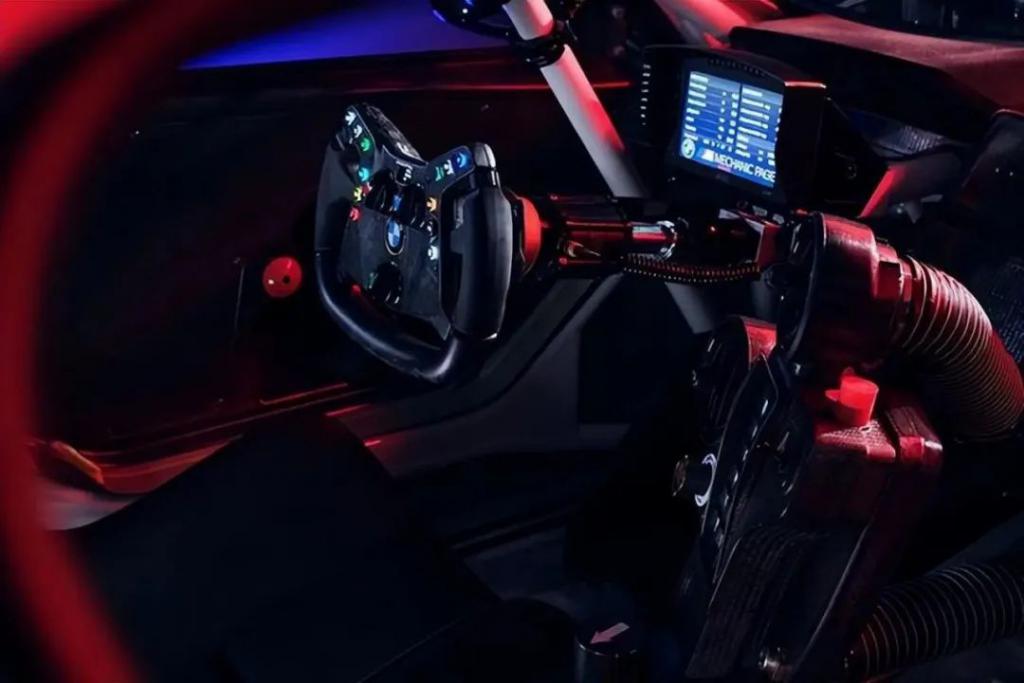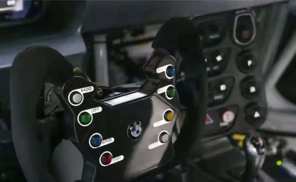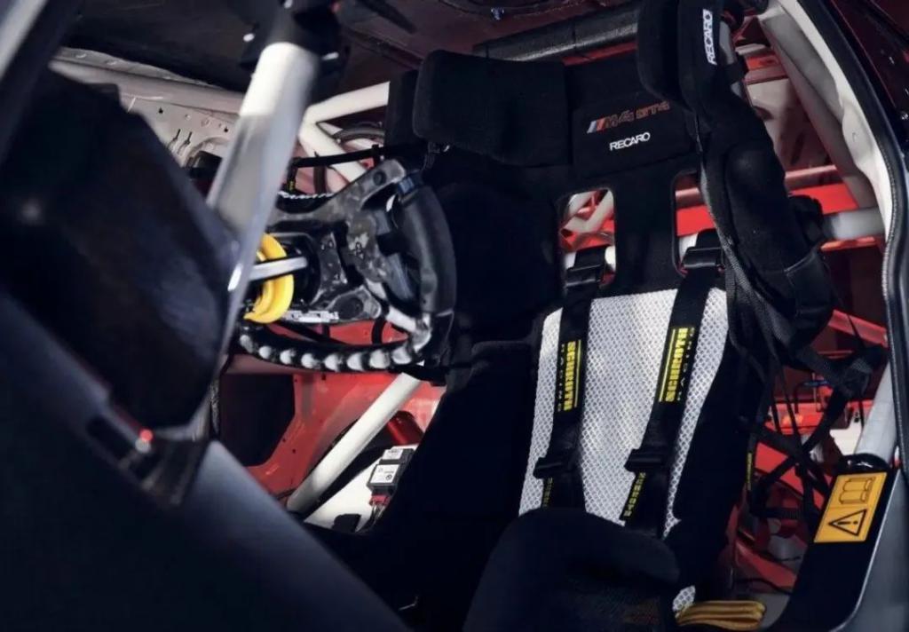 进入车内,战斗氛围感会更加浓郁,相比于量产版的 M4,M4 GT4 进行了彻底的赛车化改造,新车装备了 FANATEC GT4 多功能方向盘和专业 RECARO 通风赛车桶椅和电控设备,后排还有提高车身强度和安全性能的防滚架,舒适性想必不用多说,完全是为了赛道而生的,开这玩意跑一下长途不得患腰间盘突出。