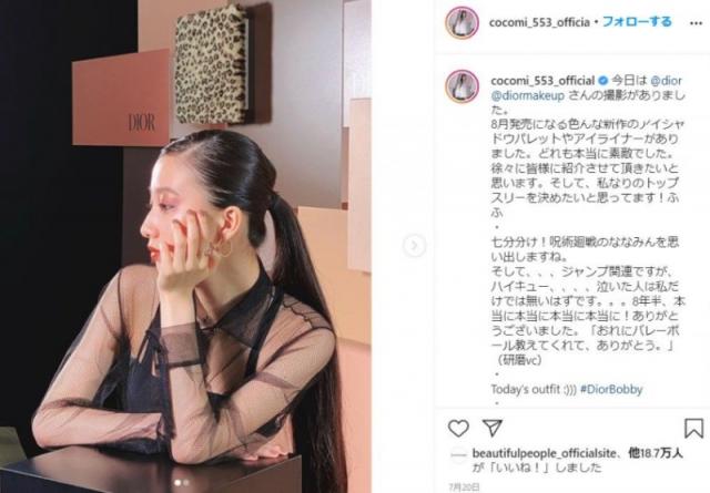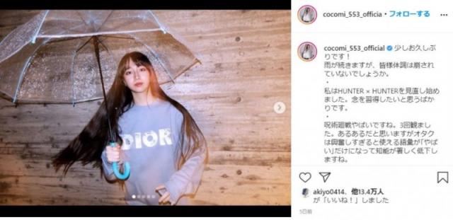 Cocomi本人自2020年3月出道后,很积极地向大家展现自己“宅”的一面。和妹妹一同举办的INS直播中也会十分开心地回答粉丝们关于动画和漫画的问题。